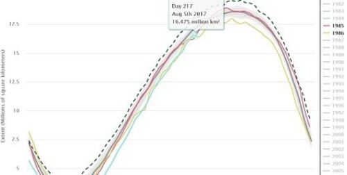 (参照) 南極の海氷面積が8月5日、1647.5万㎢となったが、今年最高となった1650.3万㎢を記録した8月2日に比べて3日間下押ししている。目下、同日比で1986年に次いで低い値に戻った。 毎年のピークは9月なのでこのまま8月2日がピークになるとは考えられないが…