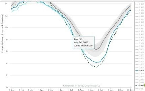 (参照) 北極の海氷面積が8月9日、598.1万㎢を記録し、600万㎢の大台を割った。今回は700万㎢割れに続いて2012年、2007年に次いで史上3位の早さだ。史上最小を記録した2012年はこの時期からさらに角度を付けて下降しているが、今年は同じことが起きるか、はた…