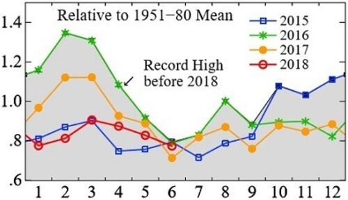 (参照) NASA:Monthly Mean Surface Temperature Anomaly (C)Land+Oceanによると、2018年6月の世界の平均気温の偏差は0.77℃で、前年同月の0.71℃よりアップした。6月としては2015年の0.80℃、2016年の0.79℃に次ぐ高さだ。 注目すべきは今年初めて前年を上回った…
